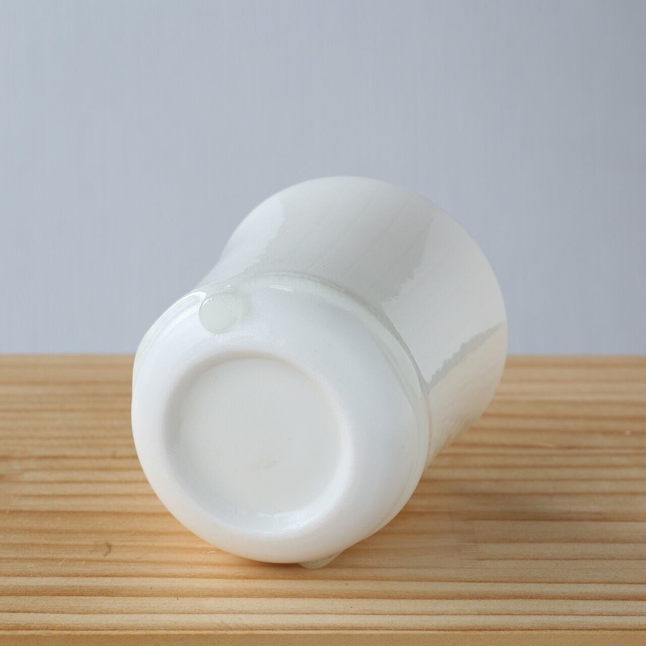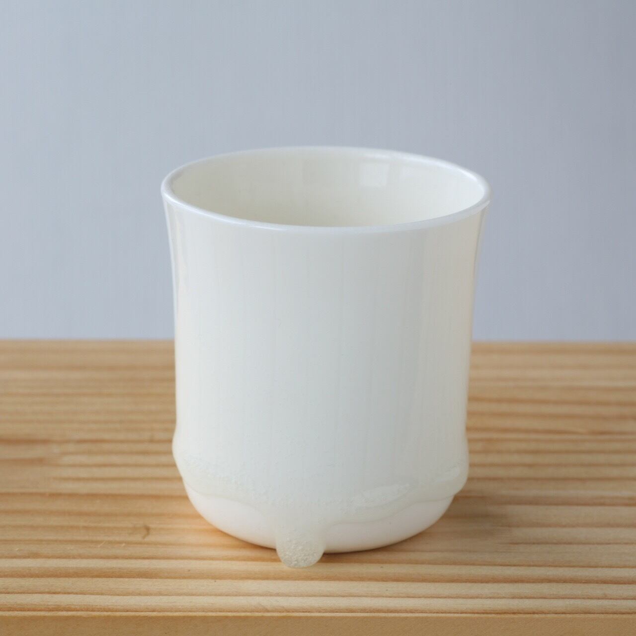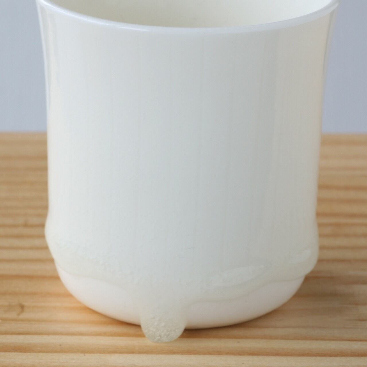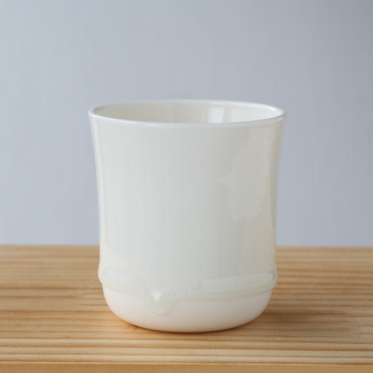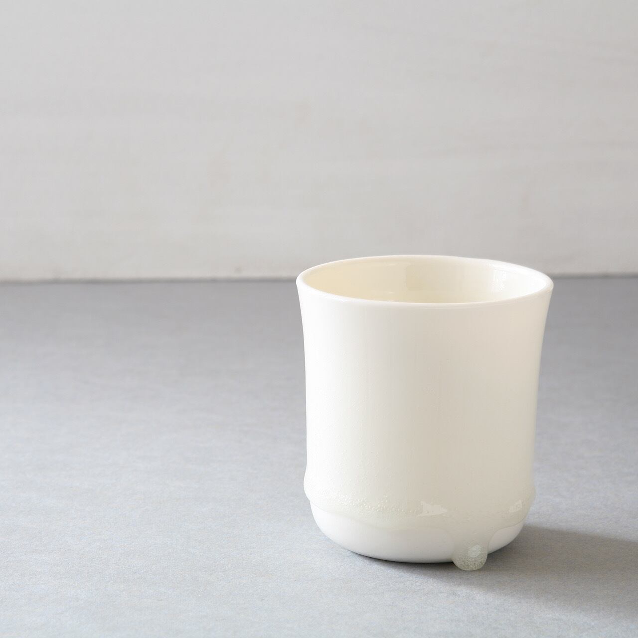 釉薬の雫の形が一つひとつ違う、白い磁器のフリーカップ。
