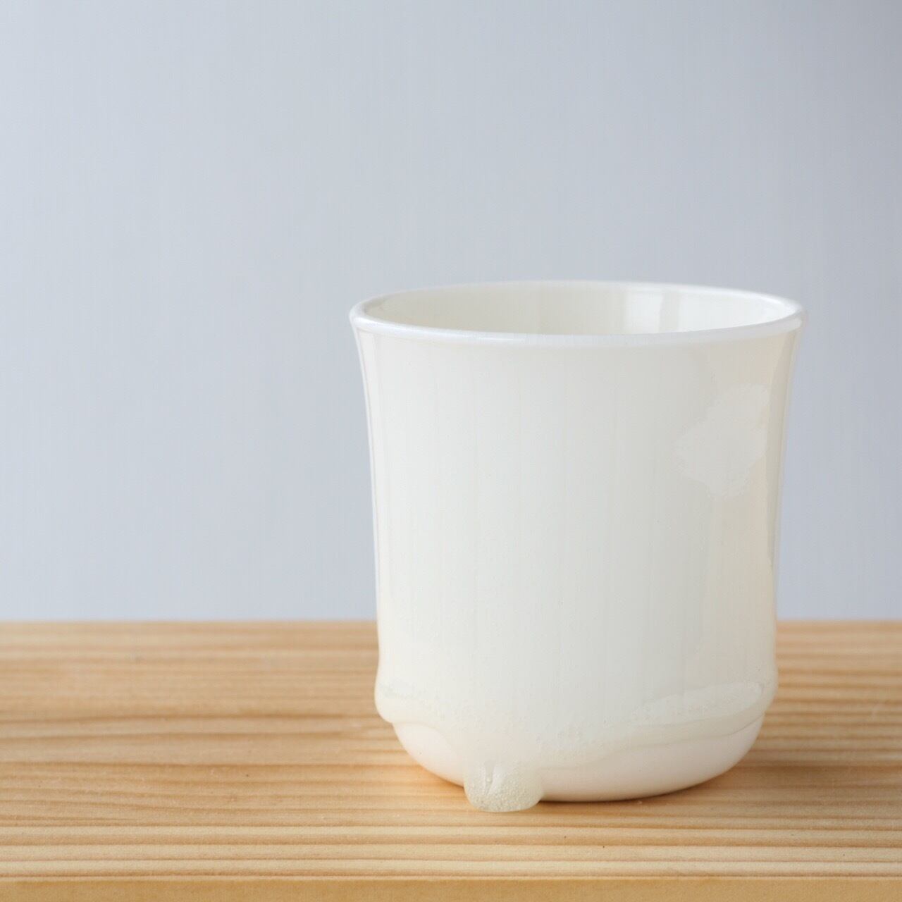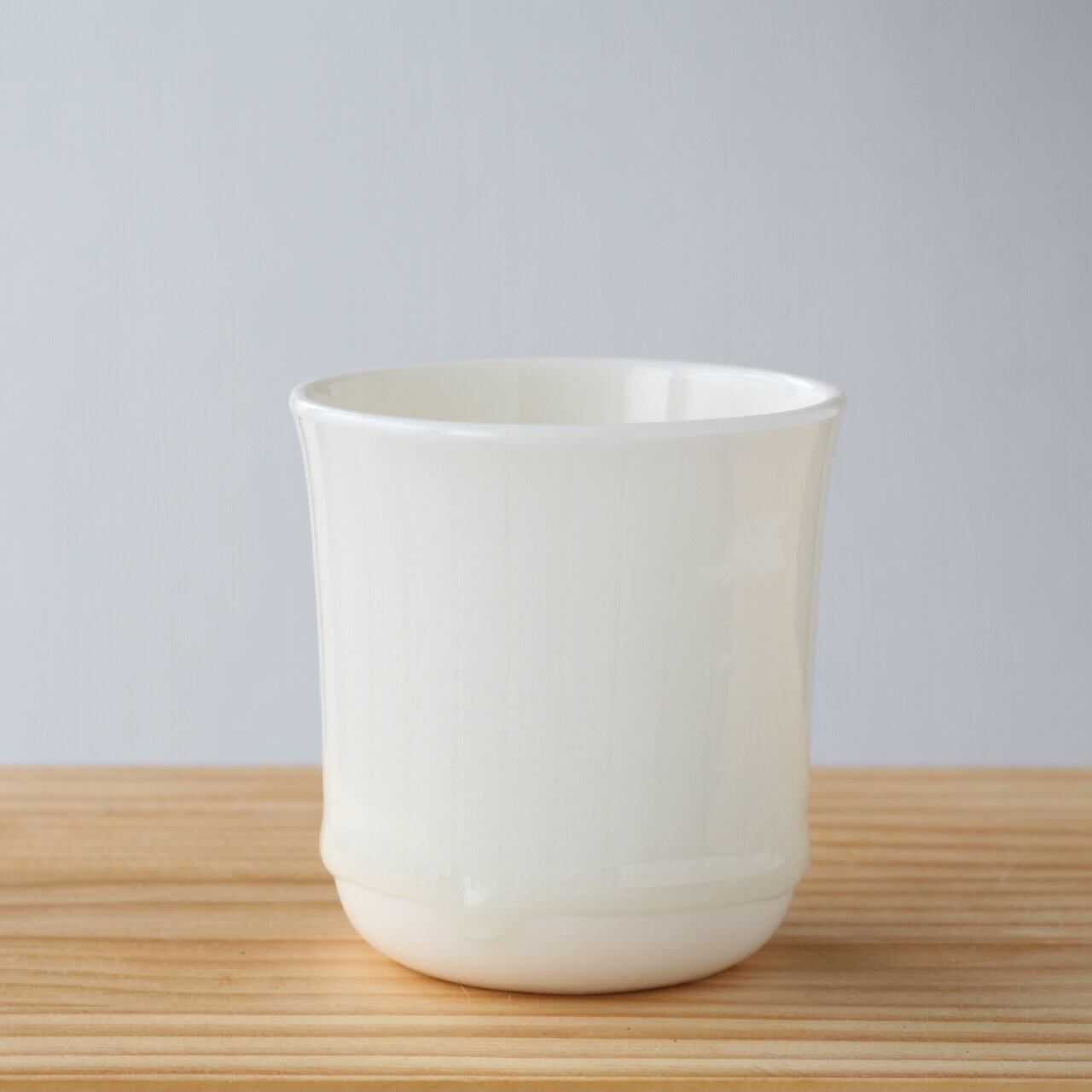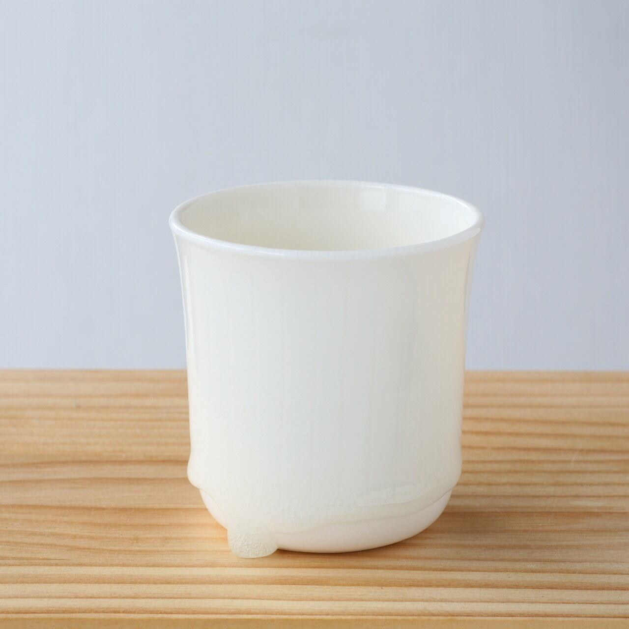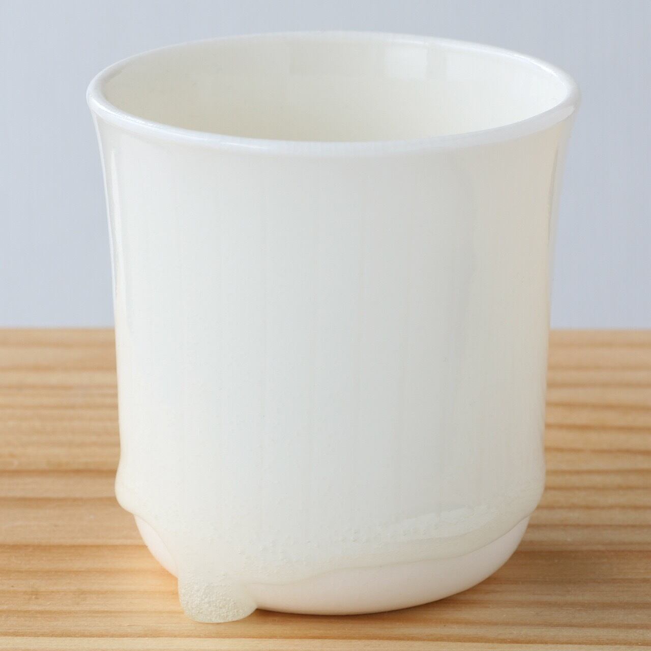釉薬の雫の形が一つひとつ違う、白い磁器のフリーカップ。