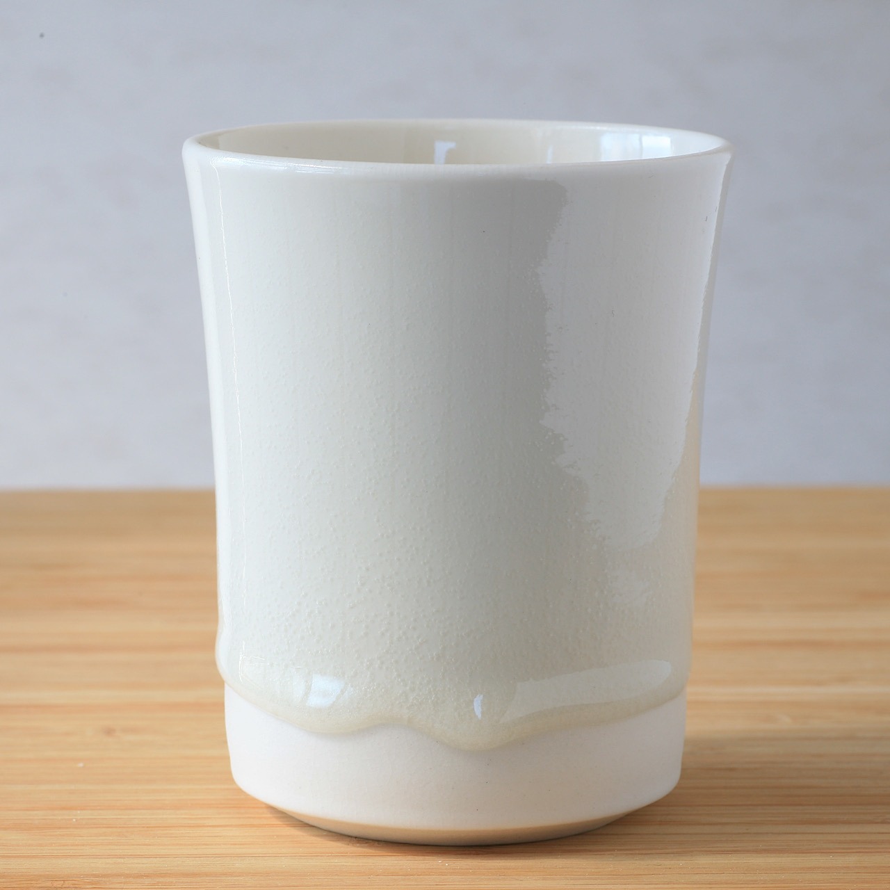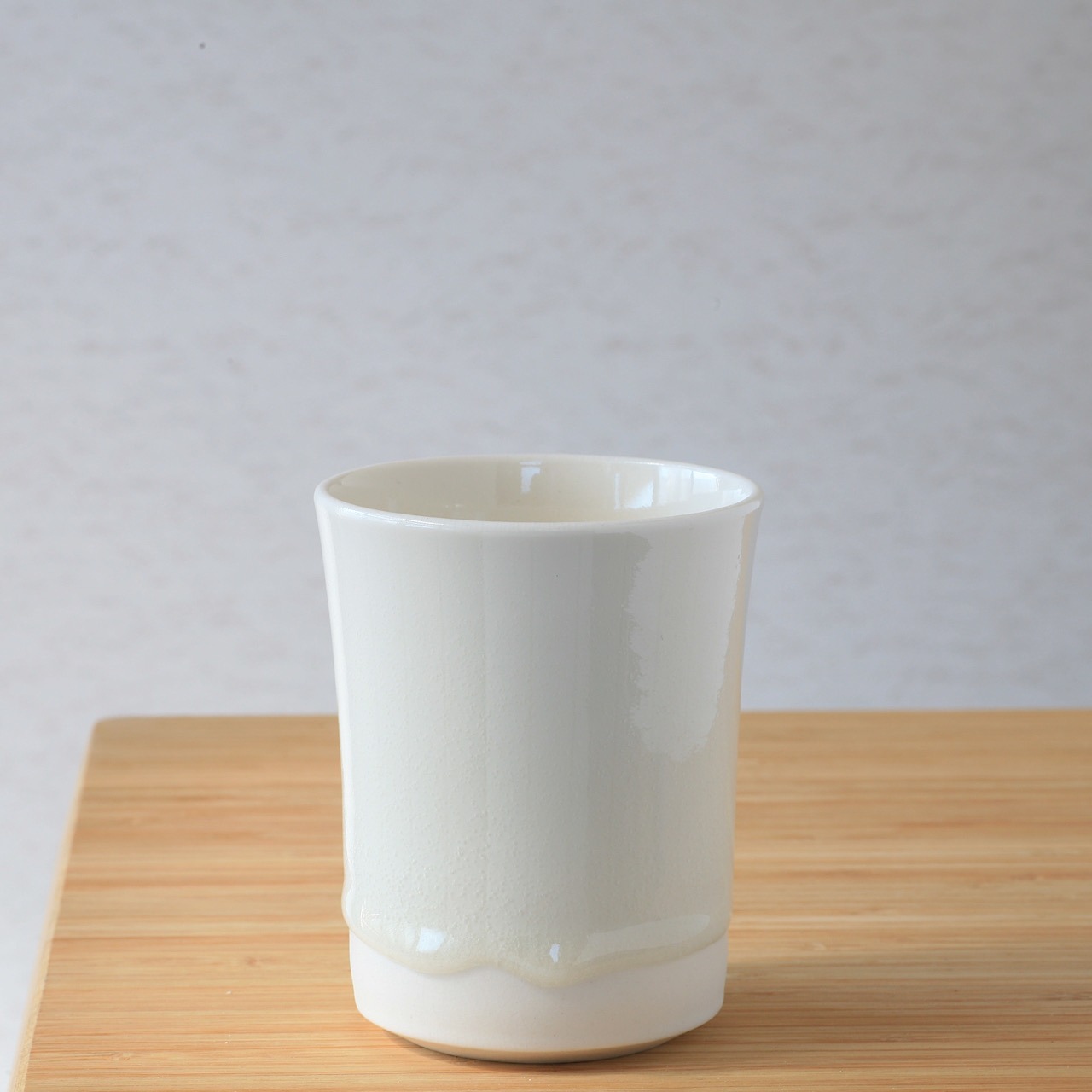 一つ一つ釉薬の雫の形が違つ白い磁器のフリーカップです。