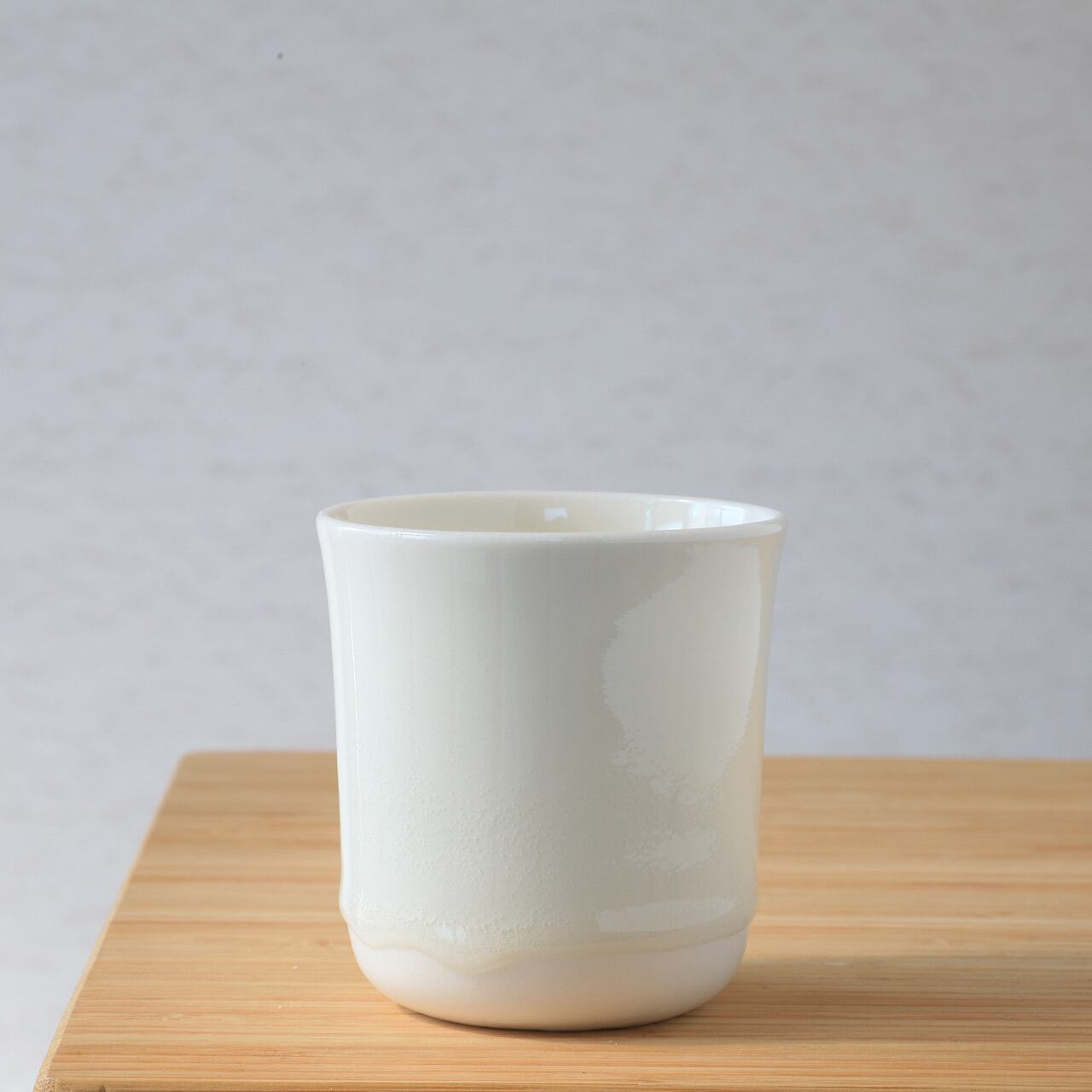 釉薬の雫の形が一つひとつ違う、白い磁器のフリーカップ。