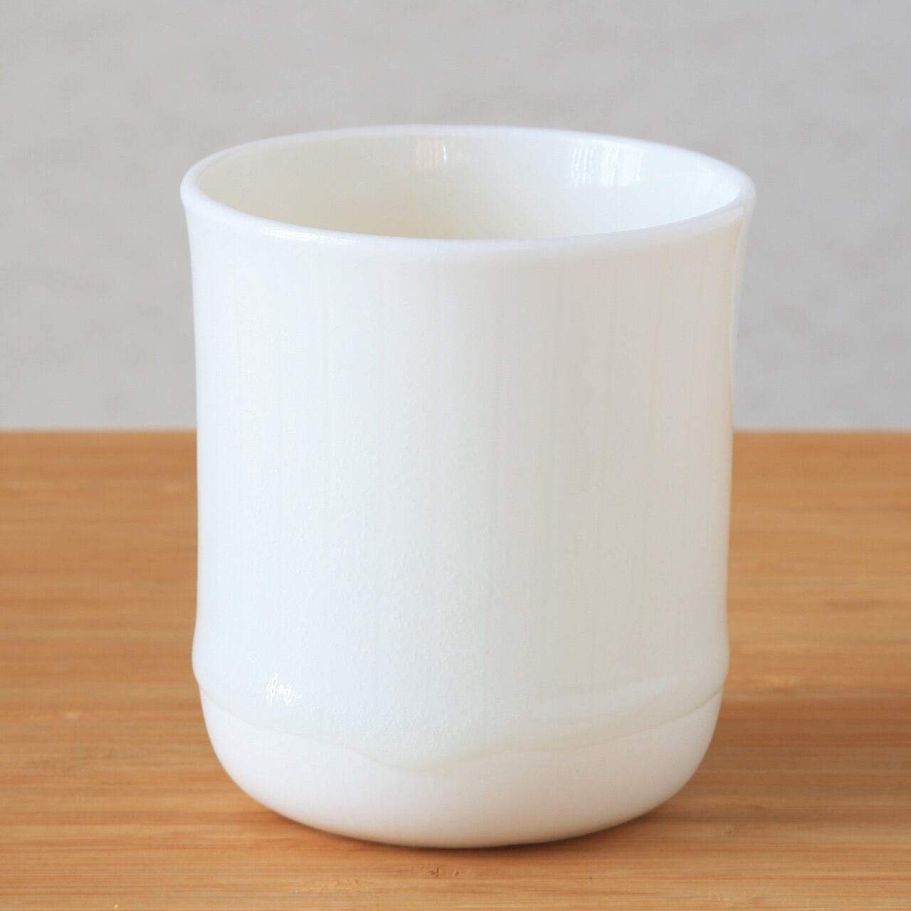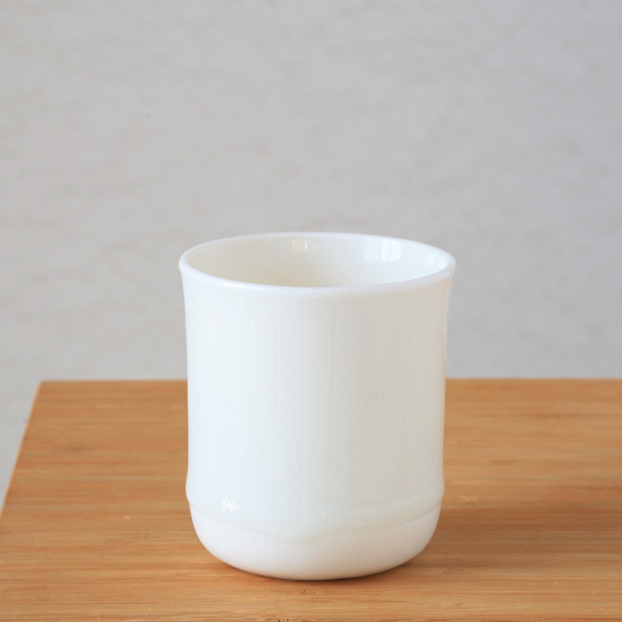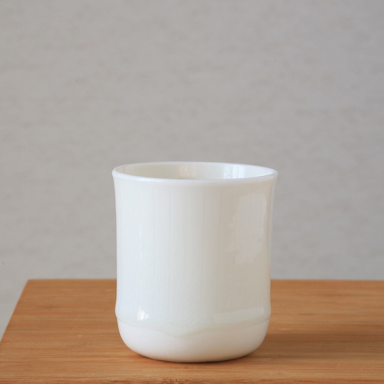 釉薬の雫の形が一つひとつ違う、白い磁器のフリーカップ。